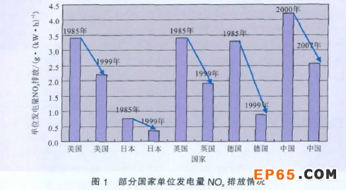 圖1 為部分國家單位發(fā)電量NOx 排放情況對比結(jié)果,看出世界主要發(fā)達國家如美國、日本、英國、德國等,其單位發(fā)電量NOx排放水平從1985年到1999年都有大幅降低,我國單位發(fā)電量NOx排放水 平從2000年到2007年也有降低,可是與上述國家相比,我國2007 年單位發(fā)電量NOx排放水平仍然 高于上述國家1999年的單位發(fā)電量NOx排放水平,更高于上述國家同時期的單位發(fā)電量NOx 排放水平。